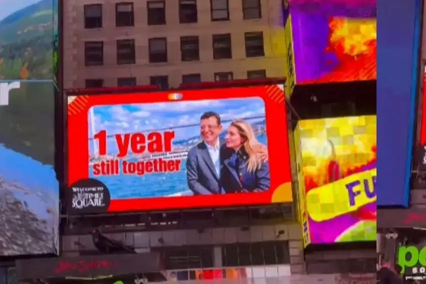 Dünyanın en işlek ve en sembolik noktalarından biri olan Times Square’de dikkat çeken bir olay yaşandı. İstanbul Büyükşehir Belediye Başkanı ve CHP’nin cumhurbaşkanı adayı Ekrem İmamoğlu’nun gözaltına alınmasının yıl dönümünde, meydandaki dev reklam ekranlarından birinde İmamoğlu ile eşi Dilek İmamoğlu’nun fotoğrafı görüntülendi. Görüntünün üzerinde İngilizce “1 year still together” (1 yıl birlikte) ifadesi yer aldı.