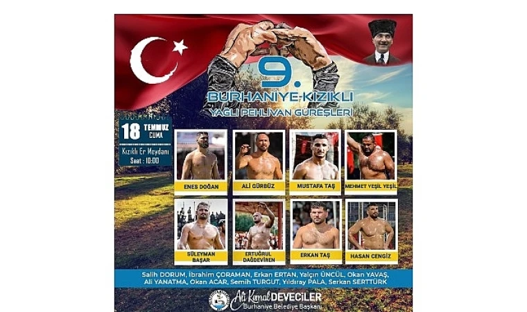 Burhaniye Belediye Başkanı Ali Kemal Deveciler’in ev sahipliğinde düzenlenecek güreşlerde, Türkiye’nin önde gelen baş ve başaltı yağlı güreş pehlivanlarının yanı sıra, birçok farklı boyda pehlivanlar da er meydanına çıkacak. Bu yılki güreşlerde; Enes Doğan, Ali Gürbüz, Mustafa Taş, Mehmet Yeşil Yeşil, Süleyman Başar, Ertuğrul Dağdeviren, Erkan Taş ve Hasan Cengiz gibi tanınmış başpehlivanlar mücadele edecek.