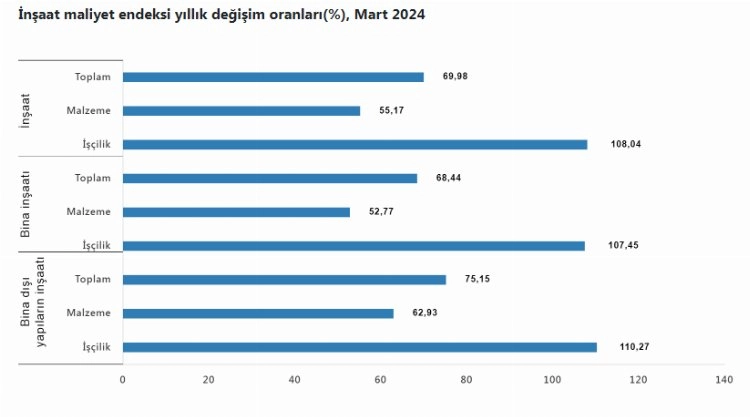 Buna göre inşaat maliyet endeksi, 2024 yılı Mart ayında bir önceki aya göre yüzde 2,11 artarken, bir önceki yılın aynı ayına göre yüzde 69,98 arttı. Bir önceki aya göre malzeme endeksi yüzde 2,54 arttı, işçilik endeksi yüzde 1,30 arttı. Ayrıca bir önceki yılın aynı ayına göre malzeme endeksi yüzde 55,17 arttı, işçilik endeksi yüzde 108,04 arttı.