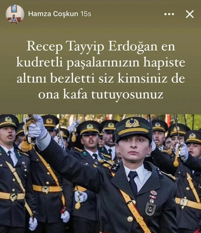 Manisa’nın Turgutlu ilçesindeki AKP Gençlik Kolları Başkanı ve Cumhur İttifakı Belediye Meclis Üyesi Adayı olan Hamza Coşkun, TSK'dan ihraç edilen teğmenlerden Ebru Eroğlu'nun fotoğrafını kullanarak üstüne, "Recep Tayyip Erdoğan en kudretli paşalarınızın hapiste altını bezletti, siz kimsiniz de ona kafa tutuyorsunuz" paylaşımı yaptı.