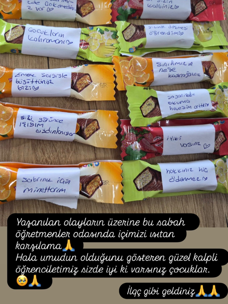 Son günlerde eğitim camiasını derinden etkileyen şiddet olaylarının ardından okul öğrencileri, öğretmenlerine moral vermek amacıyla örnek bir davranışa imza attı. Sabahın erken saatlerinde okula gelen öğrenciler, öğretmenler odasına üzerinde kendi el yazılarıyla kaleme aldıkları notların bulunduğu çikolatalar bıraktı.