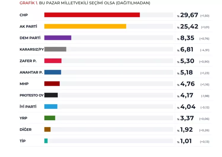 Verilen yanıtlarda CHP yüzde 29,67 oranında oy alırken AK Parti, yüzde 25,42’de kaldı. Kararsızlar ise yüzde 10 civarında.