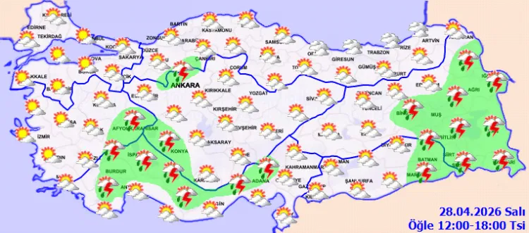 ANKARA (İGFA) - Meteoroloji Genel Müdürlüğüİ 28 Nisan Salı gününe ilişkin hava tahmin raporunu yayımladı. Yapılan son değerlendirmelere göre, Akdeniz’in iç kesimleri, Doğu Anadolu’nun doğusu ile Afyonkarahisar, Ankara’nın kuzey ilçeleri, Konya, Bingöl, Mardin, Batman ve Siirt çevrelerinde sağanak ve gök gürültülü sağanak yağış bekleniyor.