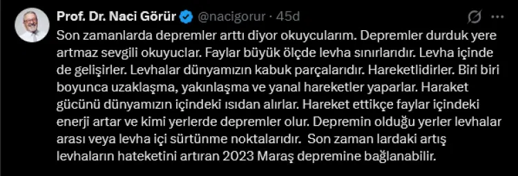 Prof. Dr. Görür'den dikkat çeken paylaşım... Malatya’daki deprem tanımlanmamış fayda meydana geldi