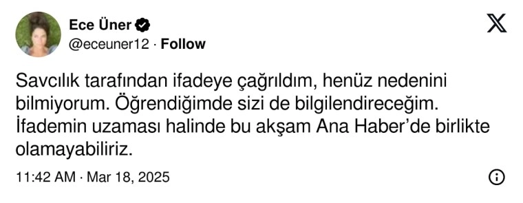 Sosyal medya hesabından açıklama yapan Üner "Savcılık tarafından ifadeye çağrıldım, henüz nedenini bilmiyorum. Öğrendiğimde sizi de bilgilendireceğim. İfademin uzaması halinde bu akşam Ana Haber’de birlikte olamayabiliriz" dedi.