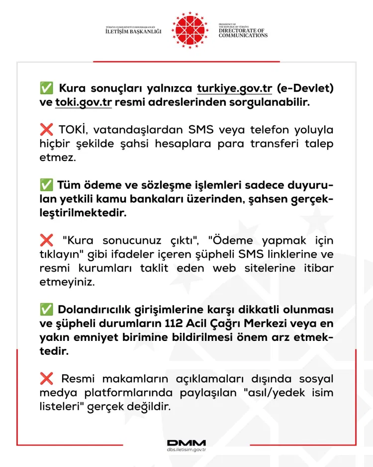 DMM'den yapılan yazılı açıklamada, bu tür girişimlere karşı dikkatli olunması gerektiği vurgulanarak, yalnızca resmi kurumların duyuru ve açıklamalarının dikkate alınmasının önemine işaret edildi. Vatandaşların şüpheli durumlarda ilgili resmi makamlarla iletişime geçmesi istendi.