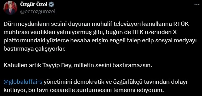 Özel, sosyal medya hesabından yaptığı açıklamada, “Dün meydanların sesini duyuran muhalif televizyon kanallarına RTÜK muhtırası verdikleri yetmiyormuş gibi, bugün de BTK üzerinden X platformundaki yüzlerce hesaba erişim engeli talep edip sosyal medyayı bastırmaya çalışıyorlar” ifadelerini kullandı.