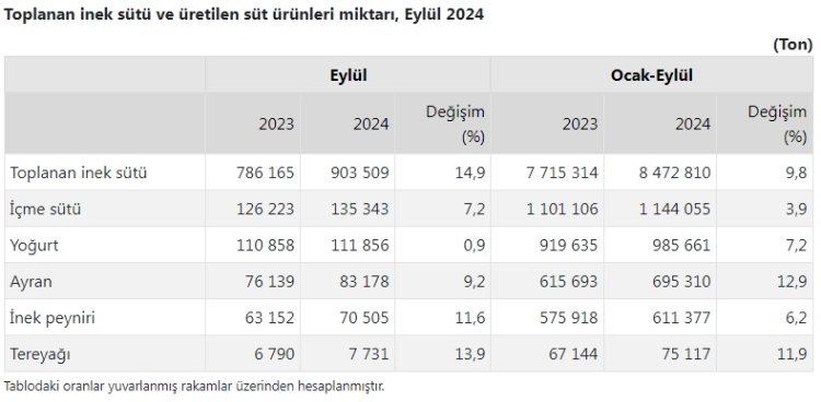 Eylül ayında bir önceki yılın aynı ayına göre, inek peyniri üretimi ,6 arttı, ayran üretimi yüzde 9,2 arttı, yoğurt üretimi yüzde 0,9 arttı, içme sütü üretimi yüzde 7,2 arttı, tereyağı üretimi ,9 arttı. Ocak-Eylül döneminde ise bir önceki yılın aynı dönemine göre, inek peyniri üretimi yüzde 6,2 arttı, ayran üretimi ,9 arttı, yoğurt üretimi yüzde 7,2 arttı, içme sütü üretimi yüzde 3,9 arttı, tereyağı üretimi ,9 arttı.